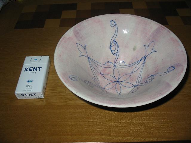 内側は淡い桃色で彩られた地の上に藍色の線で模様が描かれている。外側は真っ白。