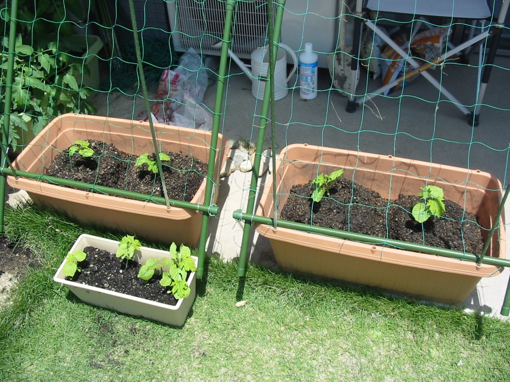 種から育ててたゴーヤの苗,育ちの良いヤツは4枚目の本葉が出てきたので,用意してあったプランターへ4つ選抜して植え替え。