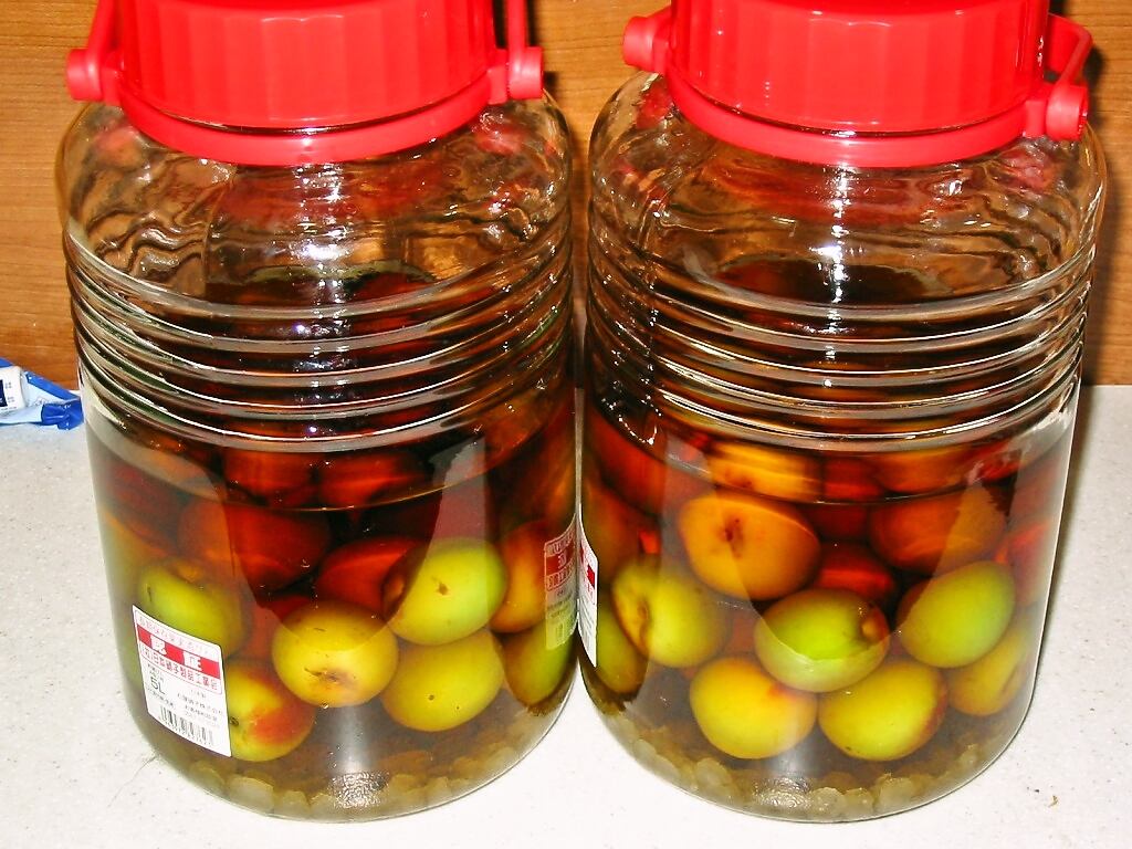 去年はラムで漬けた1.8Lと黒糖+ホワイトリカーで漬けた1.8Lの2種類を作ったけど,熟成して飲めるようになるまでえらく時間がかかった ^^; ので,今回は一昨年と同じブランデー仕立てのリキュールに氷砂糖で1.8Lを2瓶。